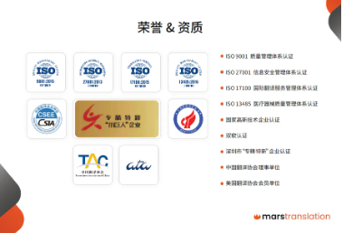 我們是業內為數不多的同時獲得ISO 13485、ISO 17100、ISO 9001、ISO 27001國際質量認證的語言服務供應商,並先後通過了國家高新技術企業認證,榮獲深圳市「專精特新」企業認證稱號,成為英國商會、中國翻譯協會及美國翻譯協會會員單位。